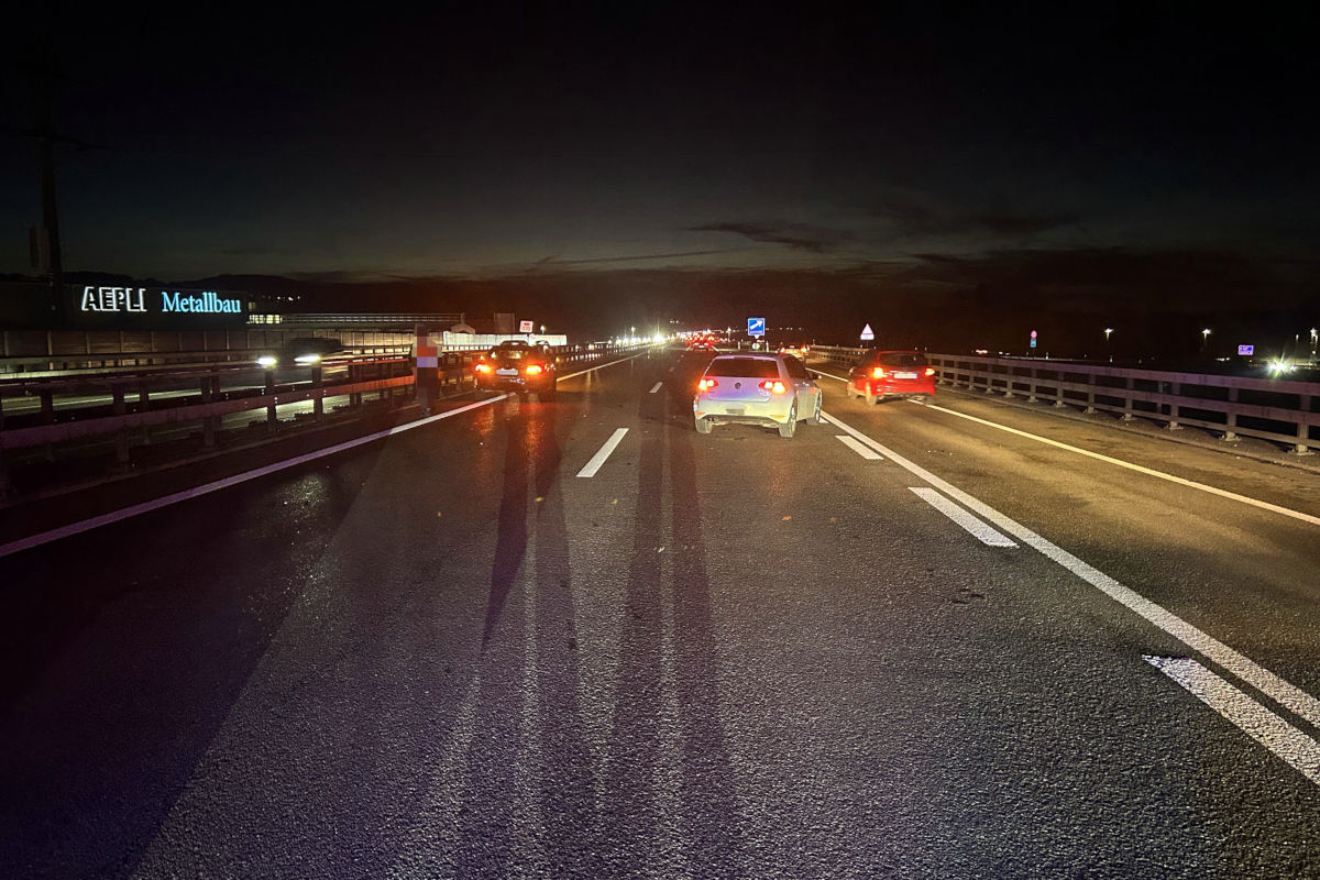 Auffahrunfall. Vor der Ausfahrt Gossau musste ein 54-jähriger Mann sein Auto auf dem Überholstreifen verkehrsbedingt stark abbremsen. Zur gleichen Zeit fuhr eine 23-jährige Frau mit ihrem Auto in dieselbe Richtung. Als sie das bremsende Auto vor ihr bemerkte, leitete sie eine Vollbremsung ein und versuchte noch, ihr Auto auf den Normalstreifen zu lenken.