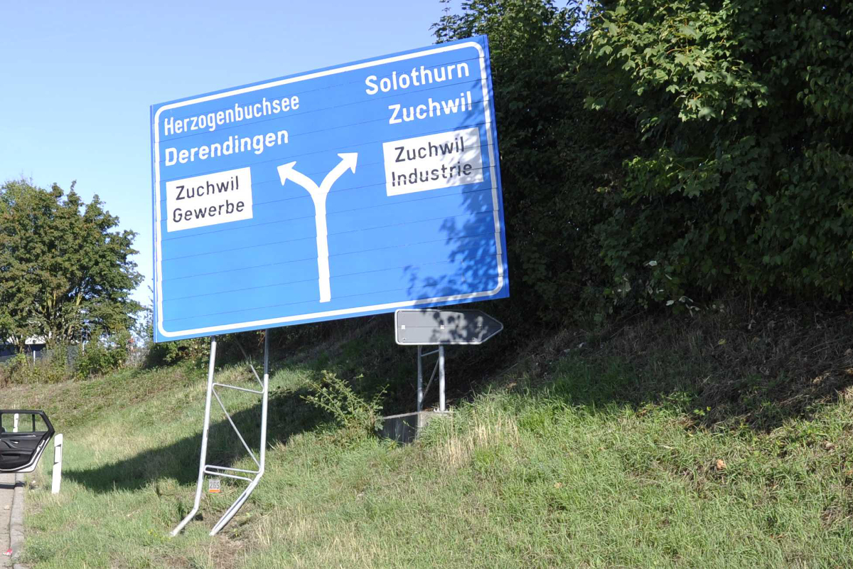 Zwischen Montag, ca. 18 Uhr, und Dienstag, ca. 9 Uhr, ereignete sich bei der Autobahnausfahrt Solothurn Ost ein Selbstunfall. Gemäss derzeitigen Erkenntnissen verliess ein bisher unbekannter Fahrzeuglenker, von der Verzweigung Luterbach in Richtung Biel fahrend, die Autobahn. Dabei verlor er in der folgenden starken Rechtskurve aus unbekannten Gründen die Herrschaft über sein Fahrzeug. Er kollidierte in der Folge zuerst mit dem Randleitpfosten und danach mit dem Wegweiser der Autobahneinrichtung. Ohne sich um die Schadenregulierung zu kümmern, setzte der unbekannte Lenker seine Fahrt in unbekannte Richtung fort.