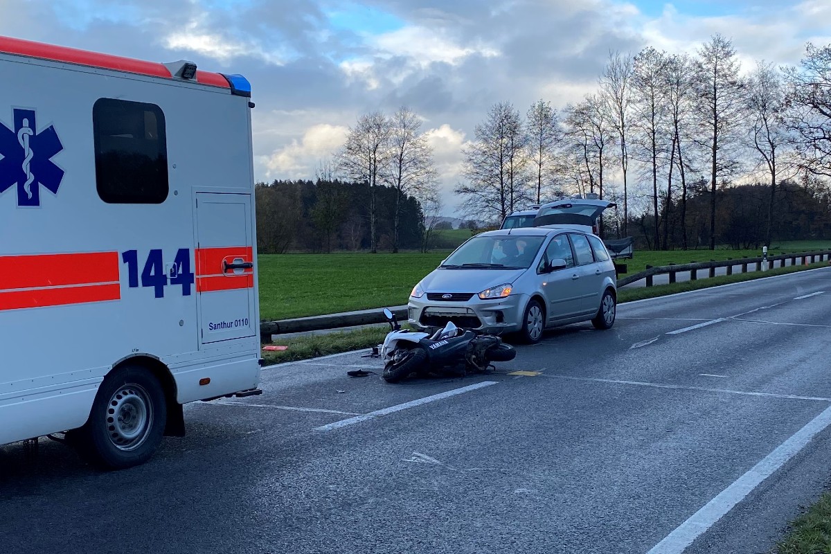 Dabei kam es zum Zusammenstoss mit einer vortrittsberechtigten Motorradfahrerin, die in Richtung Märwil fuhr. Diese stürzte und rutschte in ein entgegenkommendes Auto. Die 16-Jährige wurde leicht verletzt und musste durch den Rettungsdienst ins Spital gebracht werden.