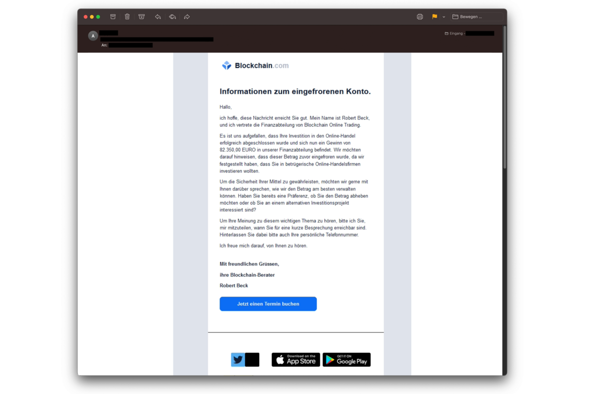 Aktuell sind betrügerische E-Mails von Blockchain.com im Umlauf, die von eingefrorenen Konten berichten. Das Ziel der Betrüger ist es, einen Termin für eine telefonische Kontaktaufnahme mit den potenziellen Opfern zu vereinbaren, um so an sensible Daten zu gelangen.