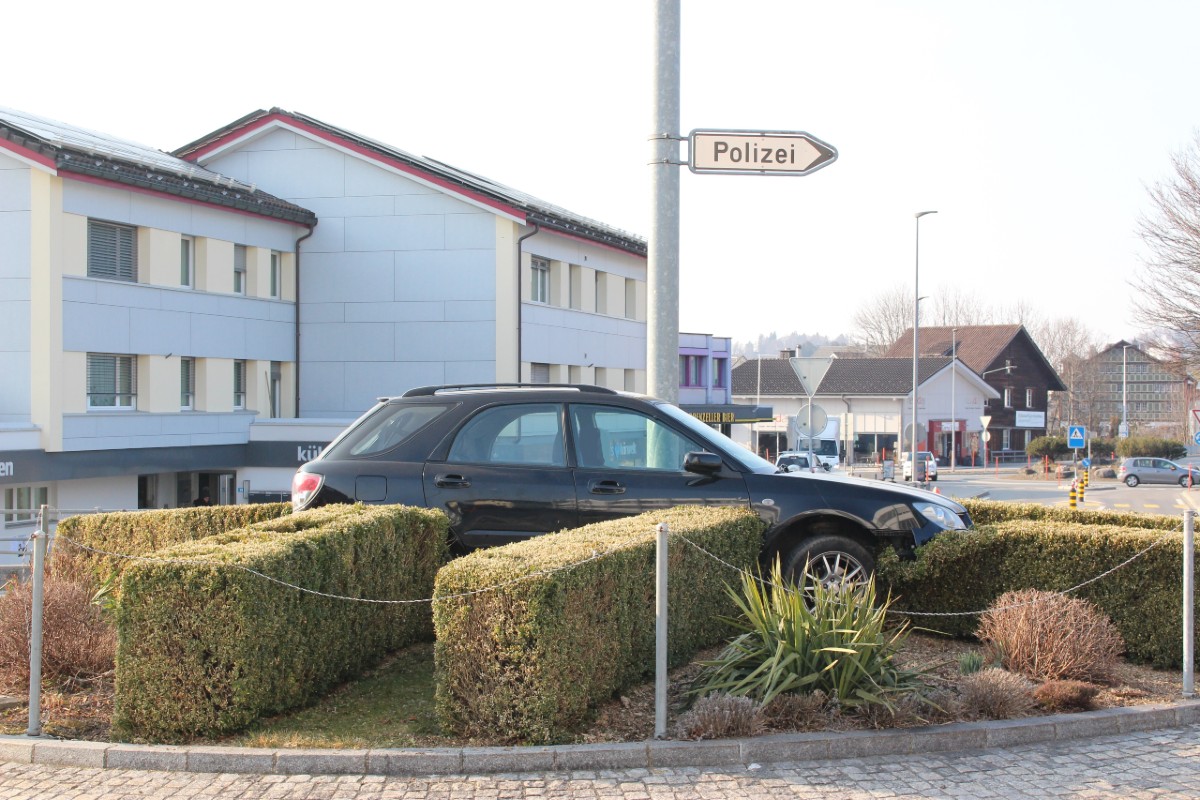 Aus noch nicht geklärten Gründen fuhr sie geradeaus auf die Mittelinsel des Kreisels, wo der Subaru zum Stillstand kam.