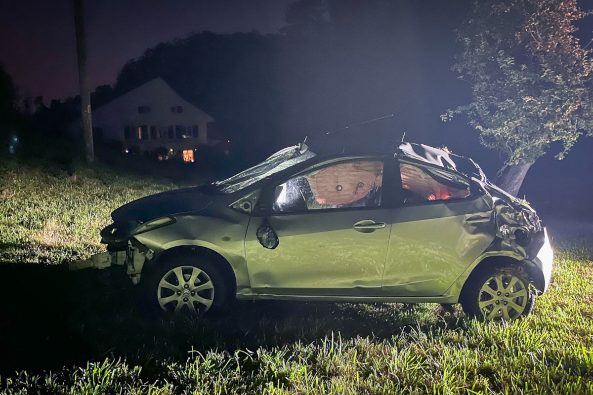 Kurz nach der Verzweigung Niederdörferstrasse geriet er in der dortigen Linkskurve rechtsseitig ab der Fahrbahn und fuhr die Grasböschung hinunter. Dabei überschlug sich das Auto und kam schliesslich im Wiesland wieder auf den Rädern stehend zum Stillstand.