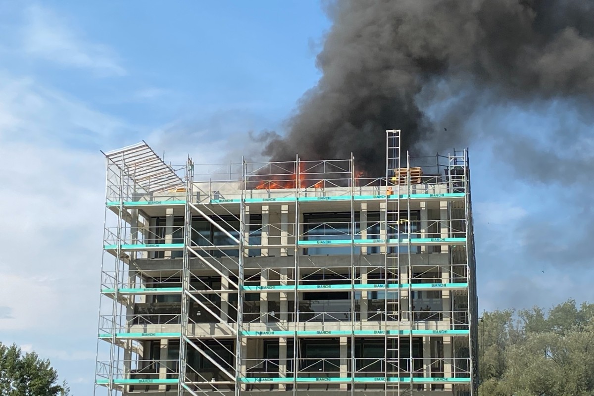 Mehrere Personen vom benachbarten Campingplatz meldeten um 16.30 Uhr der Kantonalen Notrufzentrale, dass vom Dach eines im Bau befindlichen Mehrfamilienhauses im Seemoosholz schwarzer Rauch aufsteige.