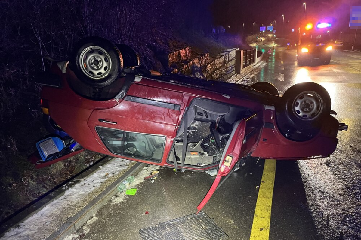 In der Nacht auf Mittwoch hat ein Autofahrer aufgrund der vereisten Fahrbahn die Kontrolle über sein Fahrzeug verloren. Er überschlug sich und blieb auf dem Dach liegen. Ein unbekanntes Fahrzeug touchierte danach das Unfallfahrzeug und fuhr davon.