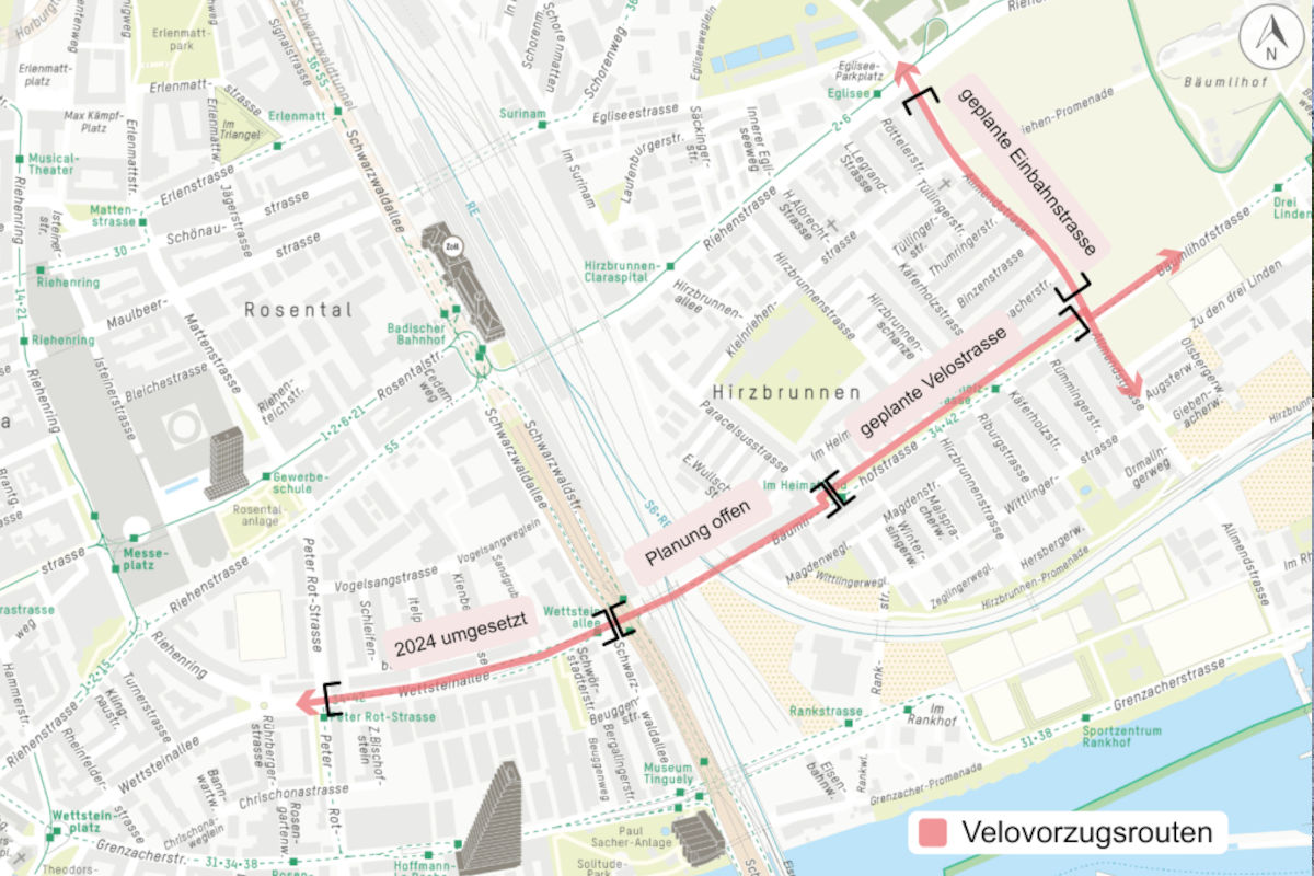 Nach Abschluss der Bauarbeiten in der Bäumlihofstrasse richtet der Kanton in der Allmendstrasse im Abschnitt Riehenstrasse bis Bäumlihofstrasse zudem eine Einbahnstrasse für Autofahrende in Richtung Bäumlihofstrasse ein. Dadurch steigt die Verkehrssicherheit auf der dort bereits bestehenden Velostrasse. Ziel ist es, dass Velostrassen möglichst frei von Durchgangsverkehr sind, was den Anforderungen von Velovorzugsrouten entspricht. Zudem kommt der Kanton damit einem Wunsch aus der Anwohnerschaft nach. Das Einrichten dieser Einbahnstrasse wurde bereits im Dezember 2023 im Kantonsblatt publiziert.