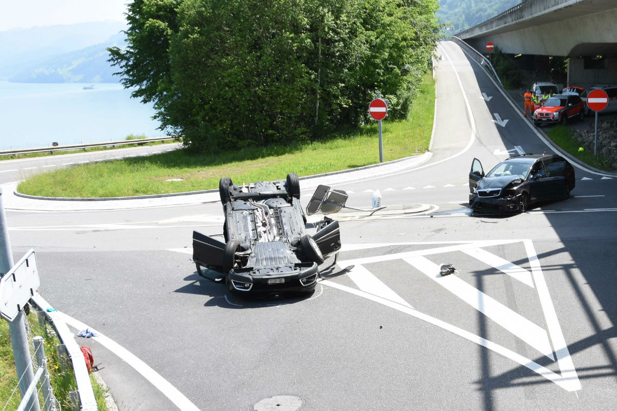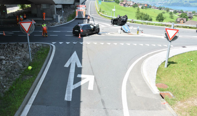 Bei der Einmündung in die Mühlebachstrasse kollidierte der Personenwagen frontal mit dem auf der Mühlebachstrasse verkehrenden, vortrittsberechtigten Personenwagen. Im Anschluss prallte der Personenwagen gegen einen Signalpfosten und kam schlussendlich im Bereich der Autobahneinfahrt Richtung Luzern auf dem Dach liegend zum Stillstand. Bei beiden Fahrzeugen entstand Totalschaden.