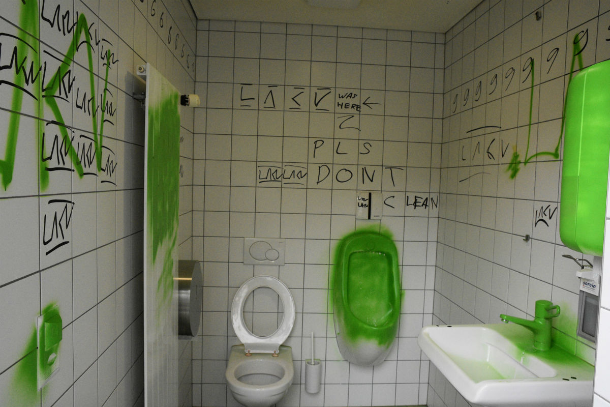 Zwischen Dienstag 16.00 Uhr und Mittwoch 07.45 Uhr wurde die öffentliche Toilette des Postgebäudes erneut mit Farbe verunstaltet. Dabei wurden sämtliche Armaturen mit grünem Farbspray besprüht und die Wände mit einem schwarzen Farbstift verunstaltet.