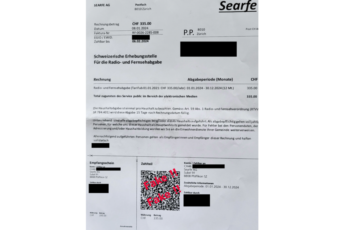 Mit der fiktiven Rechnung werden CHF 335.00 für die Abgabeperiode von 12 Monaten für den Zeitraum 2024 gefordert. Der Gesamtbetrag soll innerhalb von 15 Tagen auf ein Schweizer Bankkonto der Betrüger überwiesen werden. Dadurch versuchen die Kriminellen zeitlichen Druck aufzubauen.