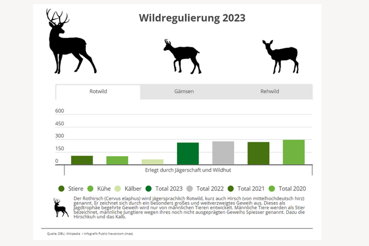 Mitte Dezember 2023 wude die Regulierung des Rotwilds, der Gämsen und der Rehe im Rahmen der Jagd und der Regulierungsabschüsse durch die Wildhut abgeschlossen. Gesamthaft wurde 2023 (1213 Tiere) die gleiche Quote wie im Vorjahr 2022 (1216 Tiere) erreicht.