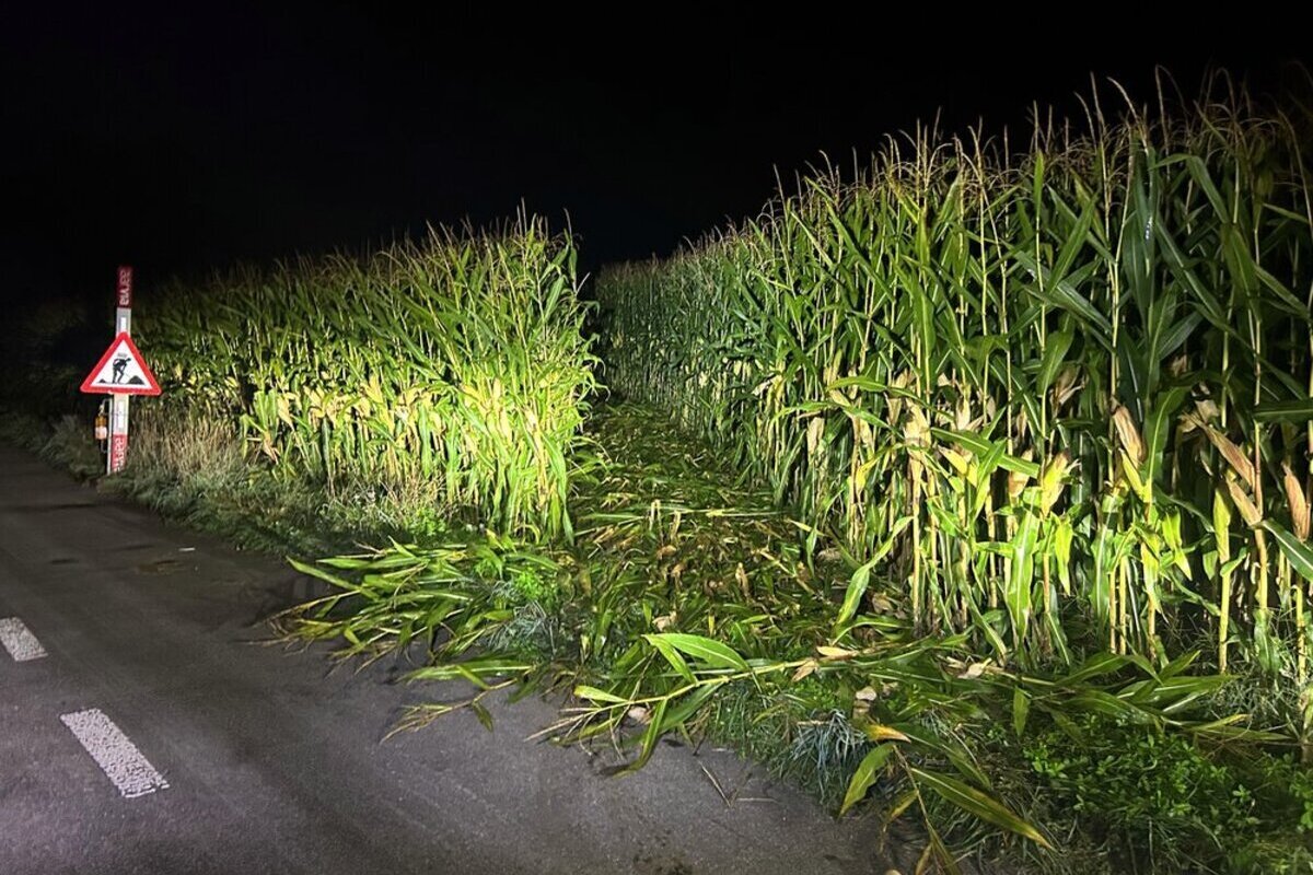 Die Patrouille wollte das Fahrzeug umgehend zur Kontrolle anhalten. Der Lenker ergriff jedoch die Flucht, durchfuhr ein Maisfeld und verursachte dabei grossen Landschaden. Auf einem angrenzenden Feldweg kollidierte der Lenker schliesslich mit einem Baumstrunk, wodurch das Fahrzeug zum Stillstand kam.