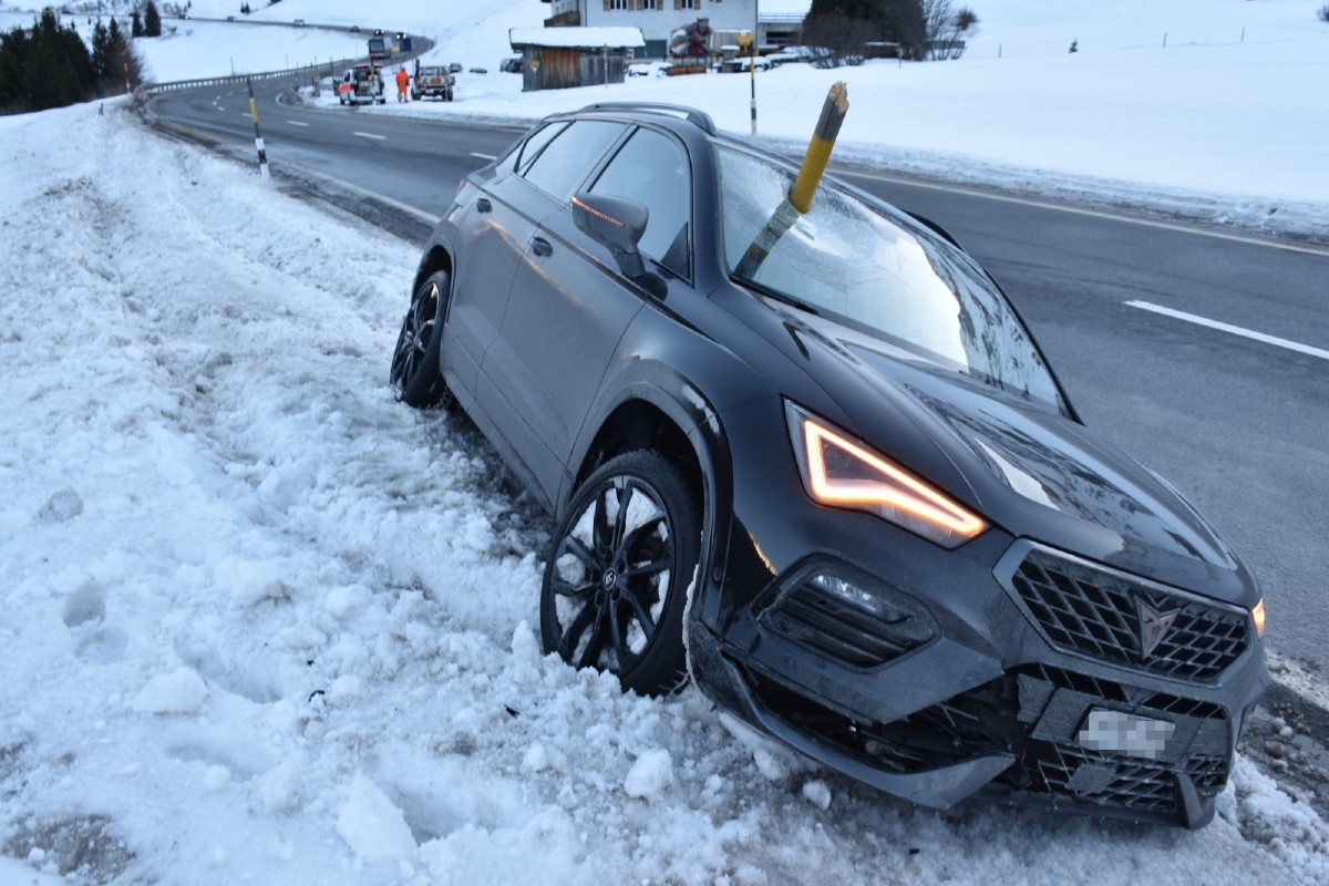 Nach dem Überholmanöver verlor sie die Herrschaft über ihr Fahrzeug und geriet rechts neben die Strasse in den Schnee. Dabei kollidierte das Auto mit einem Leitpfosten und einer Schneelatte, wobei die Schneelatte die Windschutzscheibe durchbohrte.