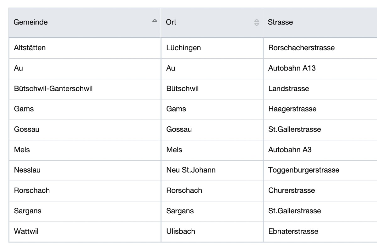 Radar - Warnungen: Diese Liste ist gültig per 06. Januar 2023 für den Kanton St.Gallen