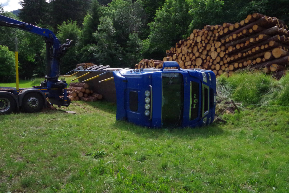 Beim Holzlagerplatz am Juchserweg war ein Chauffeur dabei, sein Fahrzeug und den Anhänger mit Langhölzern zu beladen. Anschliessend beabsichtigte der Chauffeur einige Meter vorwärts zu fahren. Dabei geriet er mit dem rechten Vorderreifen über den Strassenrand.