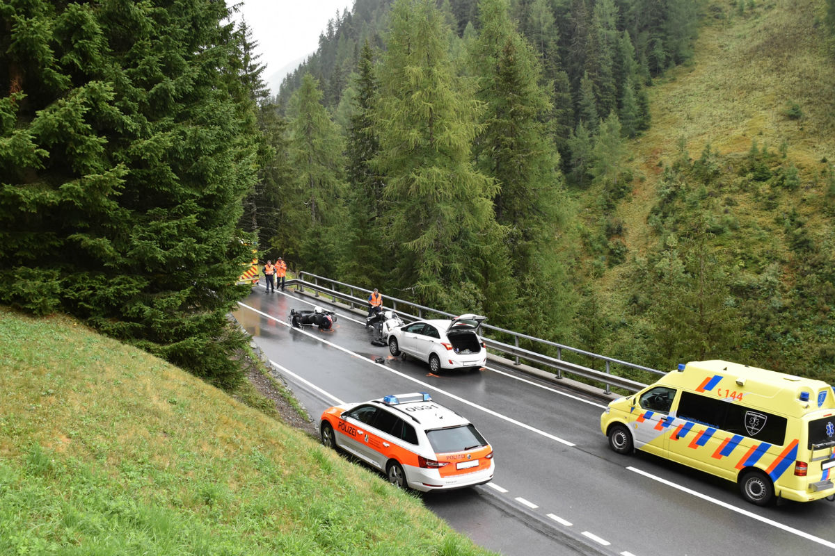 Ein 62-jähriger Motorradlenker fuhr mit seiner 65-jährigen Sozia auf der Flüelastrasse H28 um 15.20 Uhr von Susch herkommend in Richtung Davos Dorf. Bei der Örtlichkeit Bedra kam er aus noch ungeklärten Gründen auf die Gegenfahrbahn. Dort kollidierte er mit einem entgegenkommenden Motorrad und kamen zu Fall. Die Sozia rutschte auf der Fahrbahn weiter gegen einen entgegenkommenden Personenwagen. Sie wurde unter dem Auto eingeklemmt.