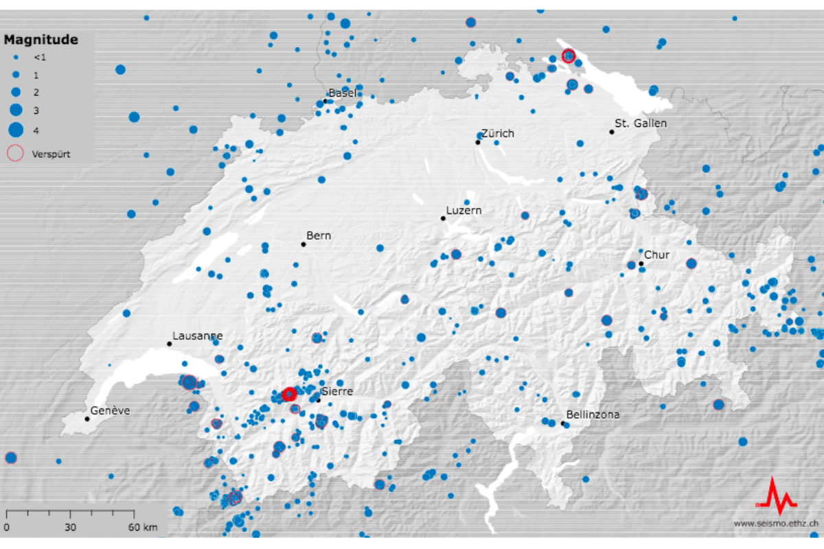 viele spürbare Erdbeben ereignet wie im langjährigen Durchschnitt. Aus der Bevölkerung gingen beim Schweizerischen Erdbebendienst (SED) an der ETH Zürich zu beinahe
