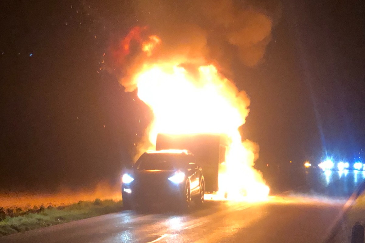 Am gestrigen Abend kam es auf der Othmarsingerstrasse zu einem Brand. Aus noch ungeklärter Ursache fing der Wohnwagenanhänger, während der Fahrt, Feuer.