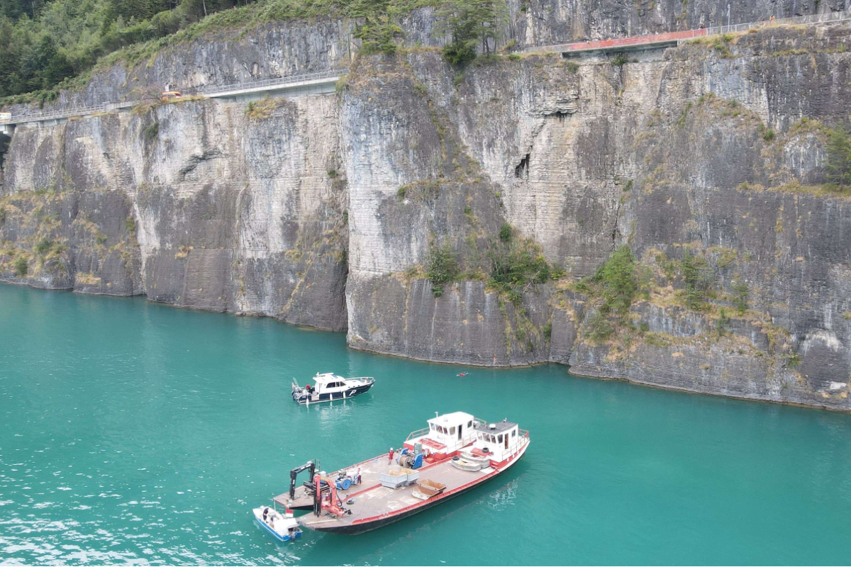 unter der Oberfläche machten Taucher der Kantonspolizei Schwyz weitere Sicherungsarbeiten am Unfallfahrzeug. Dabei stellten die Einsatzkräfte im total beschädigten Fahrzeug ein Todesopfer fest und