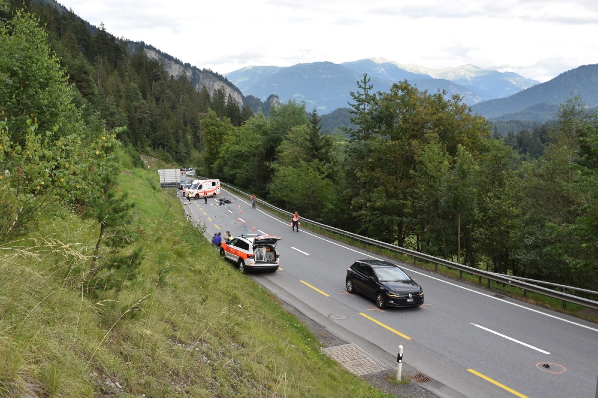 Eine vierköpfige Motorradgruppe aus Spanien fuhr am Dienstag von Ilanz kommend über die Hauptstrasse H19 in Richtung Tamins. Kurz vor 17.30 Uhr kam es nach dem Flimsersteintunnel in einer Rechtskurve zu einer Kollision zwischen dem an vierter Stelle fahrenden 31-Jährigen und einem in Richtung Flims fahrenden 19-jährigen Automobilisten. Dabei wurde der Motorradfahrer schwer verletzt.