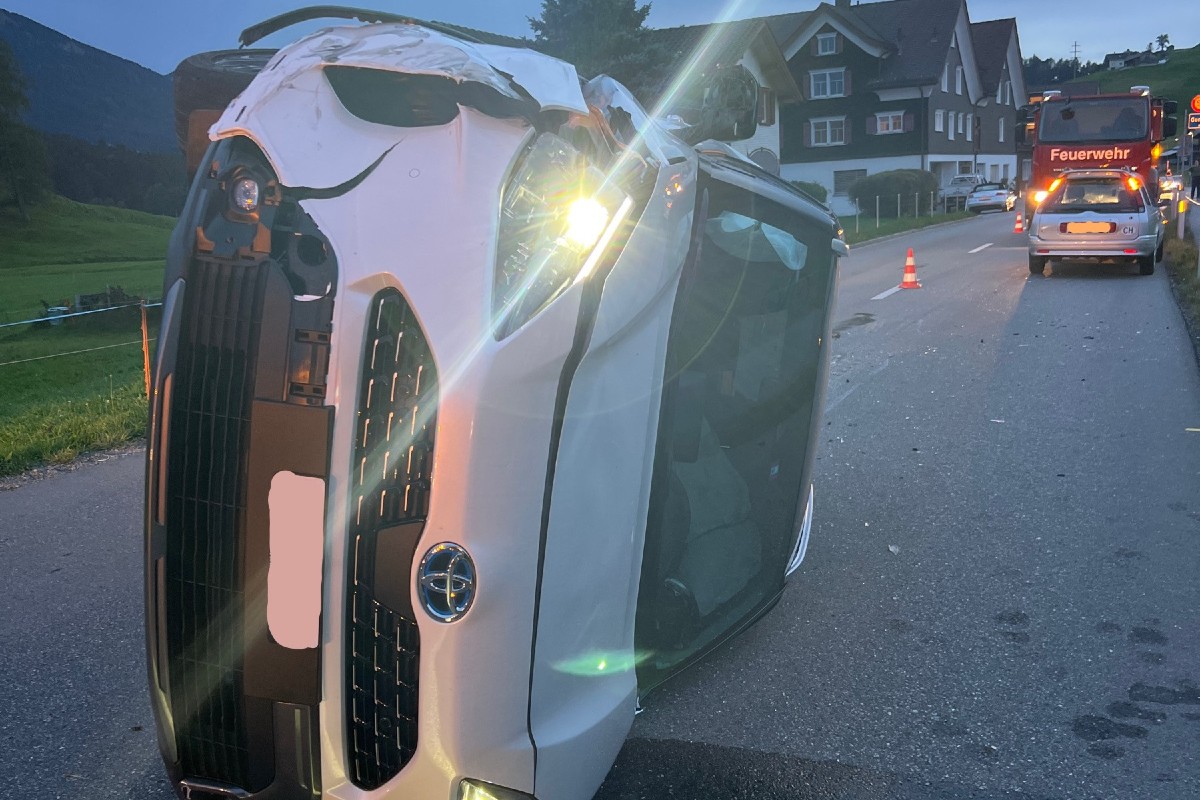 Unfallverursacher landet beim Verkehrsunfall in Gonten AI auf der Seite.