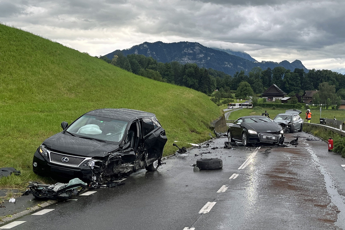Auf der Kantonsstrasse zwischen Küssnacht und Greppen kam es am Sonntag zu einer seitlich frontalen Kollision. An dem Unfall waren drei Autos beteiligt. Eine Person musste durch die Feuerwehr aus dem Unfallfahrzeug befreit werden. Insgesamt wurden sechs Personen verletzt, eine davon erheblich. Aufgrund des Unfalls war die Kantonsstrasse rund vier Stunden gesperrt.