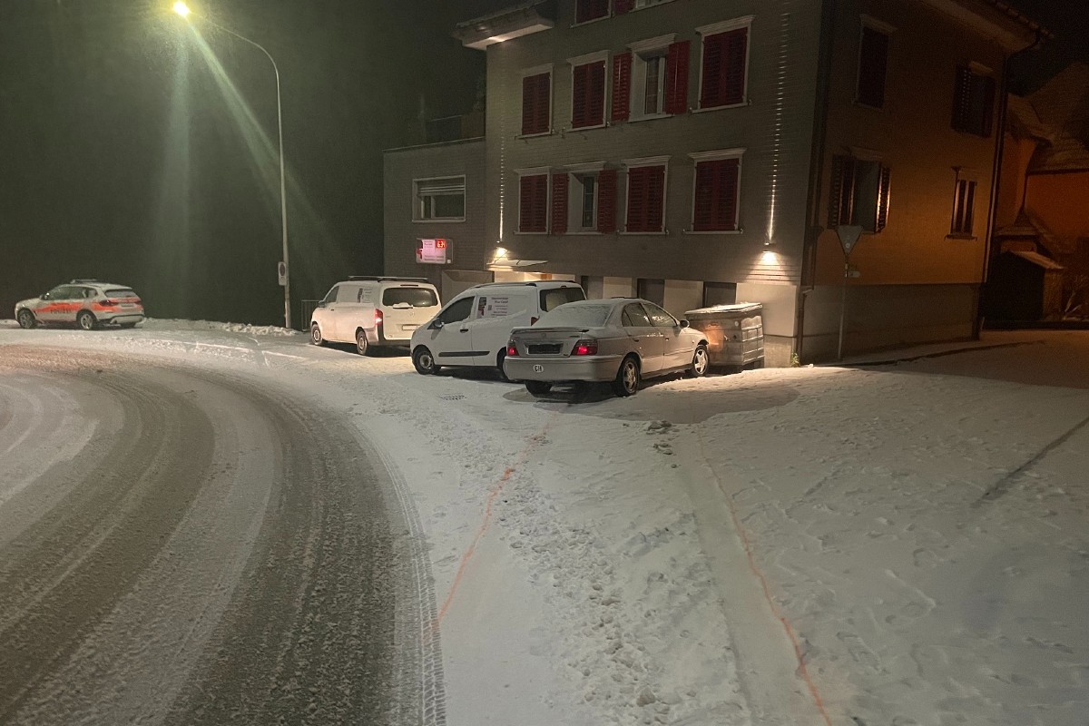 Kurz nach 5.45 Uhr fuhr ein 39-jähriger Automobilist von Wolfhalden in Richtung Rheineck. Bei der scharfen Linkskurve im Bereich Vorderdorf kam er auf der schneebedeckten Fahrbahn ins Rutschen und kollidierte mit einem parkierten Fahrzeug sowie einem Abfallcontainer.