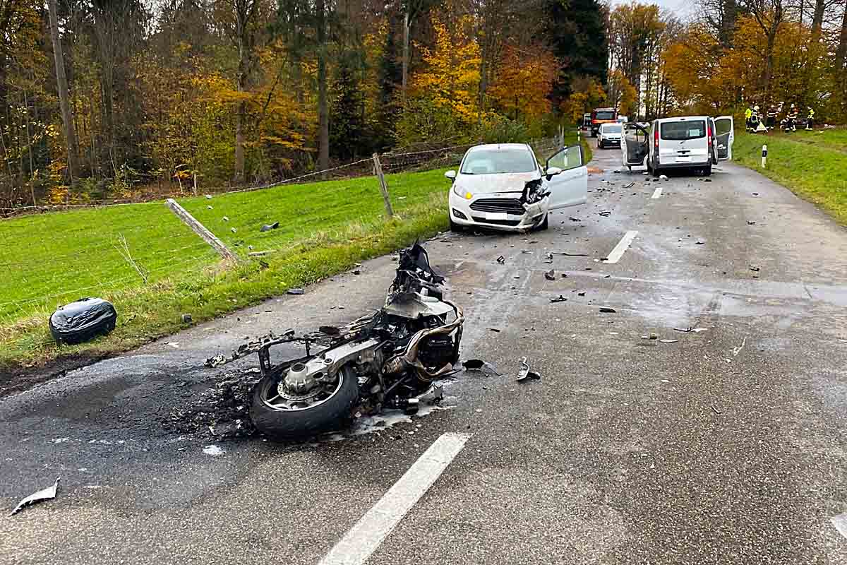 Die Fahrzeuge fingen Feuer. Der Motorradfahrer erlitt beim Unfall schwere Verletzungen, denen er noch auf der Unfallstelle erlag.
