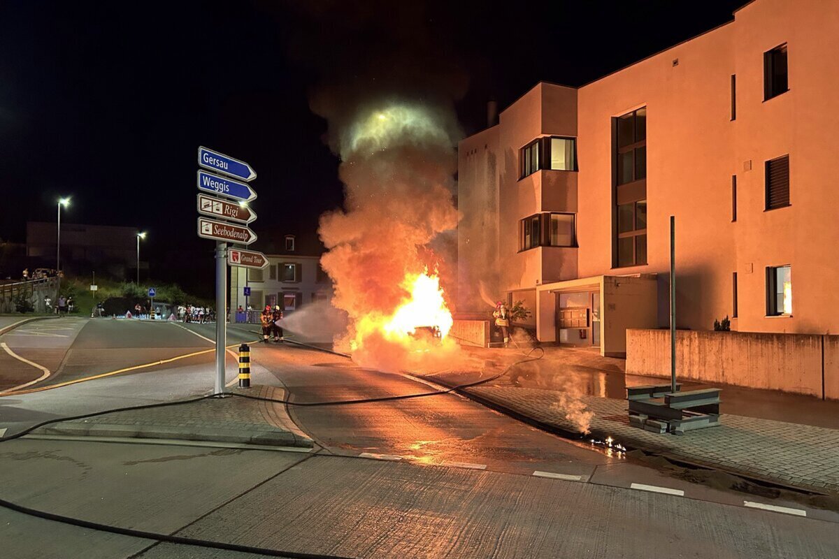 Der Mann konnte sein Auto nach der Tunnelausfahrt auf dem Trottoir an der Grepperstrasse stoppen und das Fahrzeug unverletzt verlassen. Danach geriet der PW in Vollbrand. Die ausgerückte Stützpunkt Feuerwehr Küssnacht konnte den Brand rasch löschen und verhindern, dass die Flammen auf das danebenstehende Mehrfamilienhaus übergriffen. Als Brandursache steht ein technischer Defekt im Vordergrund.
