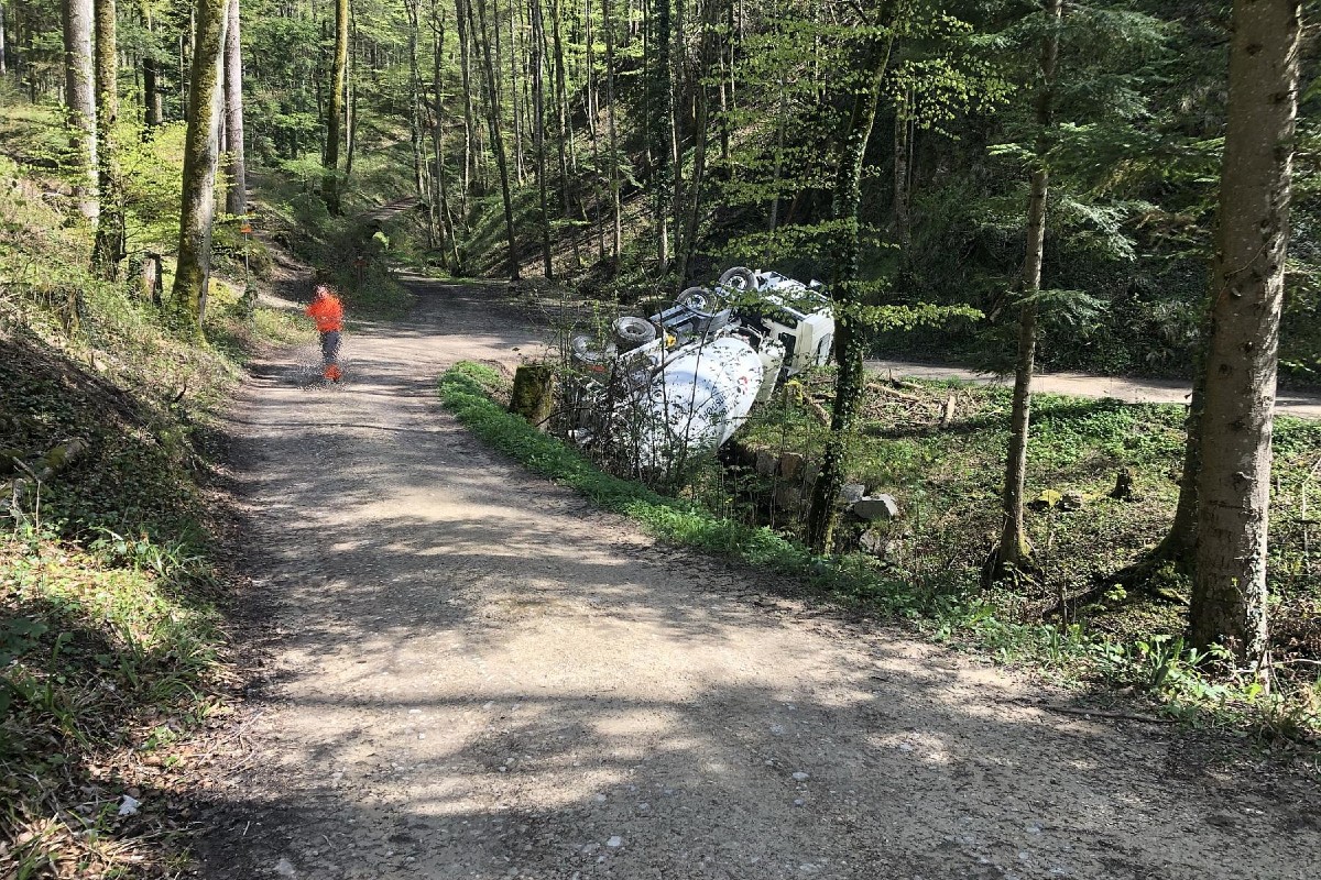 Am Montagnachmittag, 03. Mai 2021, kurz nach 14.30 Uhr, kam es in Bennwil BL, auf einem Waldweg Richtung Hof Oberer Dielenberg, zu einem Selbstunfall, wobei ein Betonmischer bei einem Wendemanöver in ein Bachbett kippte. Personen wurden keine verletzt.