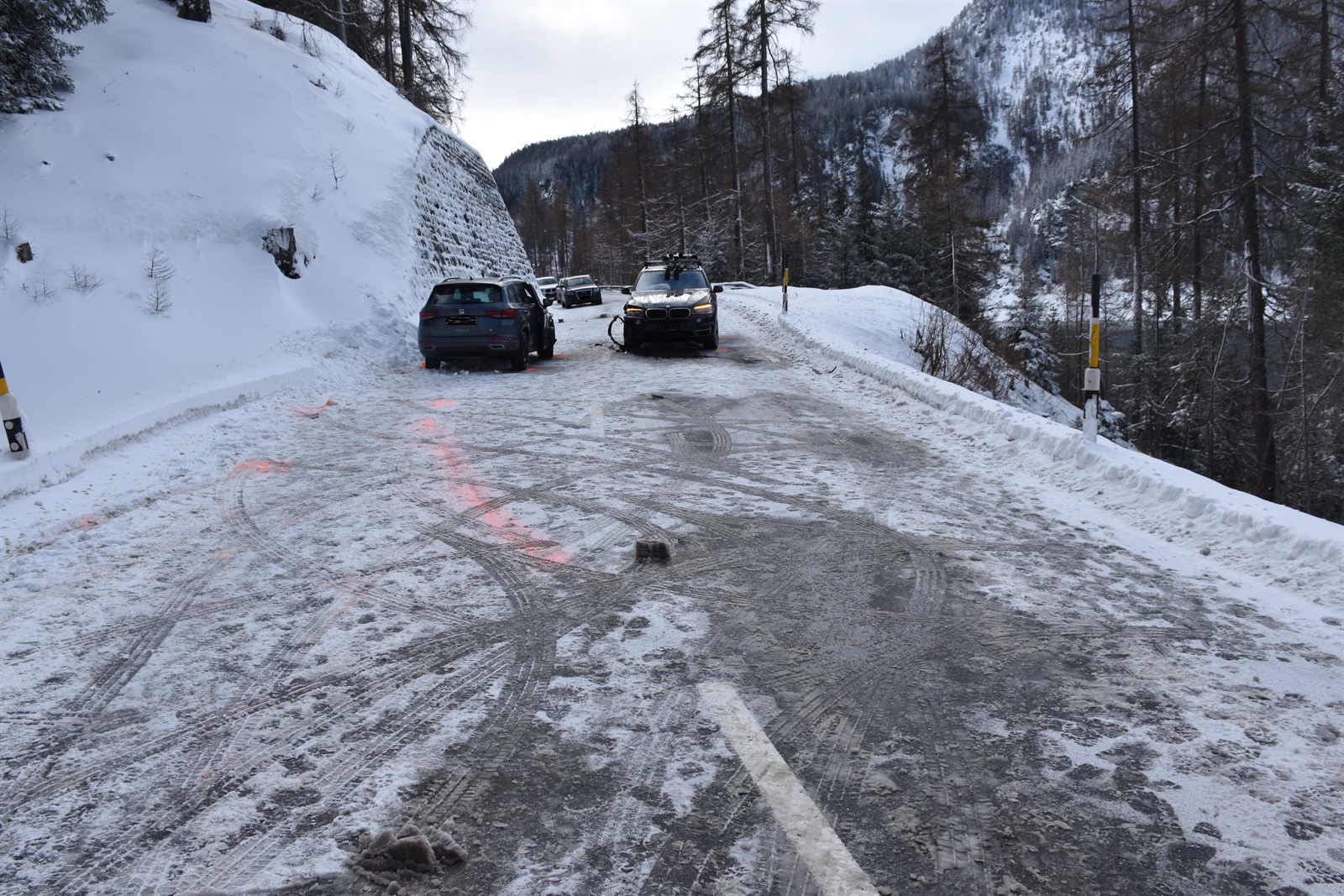 Aufgrund der schneebedeckten Fahrbahn rutschte jeweils ein Fahrzeug in einer Rechtskurve auf die Gegenfahrbahn, wo es zur Frontalkollision mit einem ihm entgegenkommenden Personenwagen kam. Bei einer dieser Kollision wurden insgesamt drei Personen leicht verletzt und durch die Rettung Mittelbünden ins Spital nach Savognin gebracht. Da die Fahrbahn wegen den Unfallfahrzeugen nicht mehr passierbar war, musste die Passstrasse für längere Zeit gesperrt werden. Anschliessend wurde der Verkehr an den Unfallfahrzeugen vorbei geleitet bis diese durch die Pikettgarage abgeschleppt werden konnten.