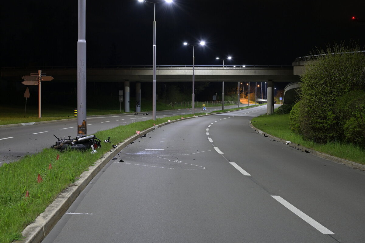 In der Rechtskurve, auf der Höhe der Auffahrt zur Albert-Einstein-Strasse, verlor der Motorradfahrer aus bisher unbekannten Gründen die Herrschaft über sein Motorrad, kollidierte mit einem Kandelaber und wurde mehrere Meter weggeschleudert.