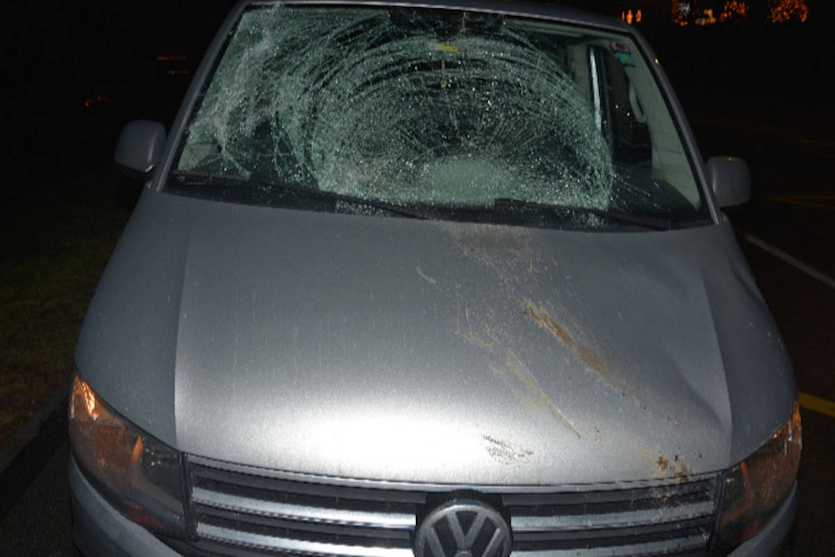Der Hirsch wurde durch die Wucht des Aufpralls über die Motorhaube auf die Windschutzscheibe geschleudert. Der Hirsch verendete am Unfallort. Das Auto wurde stark beschädigt.