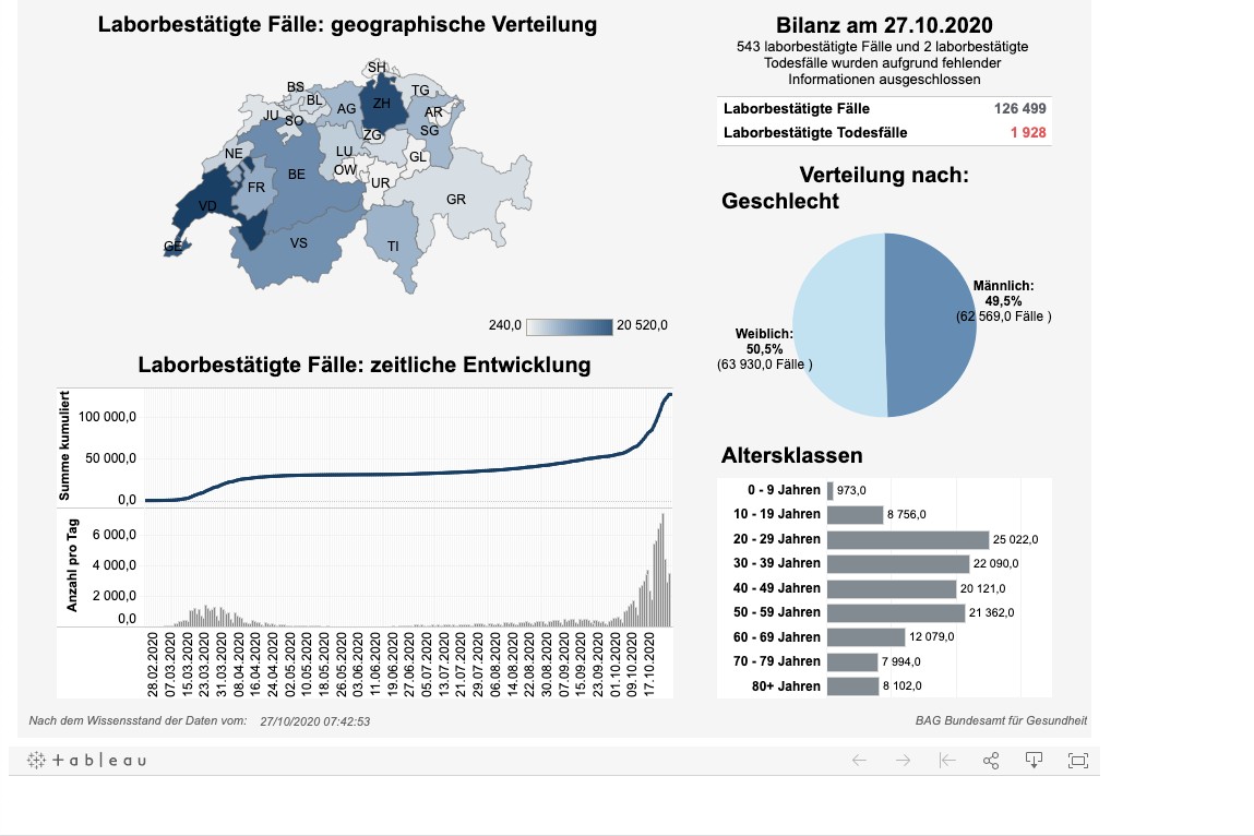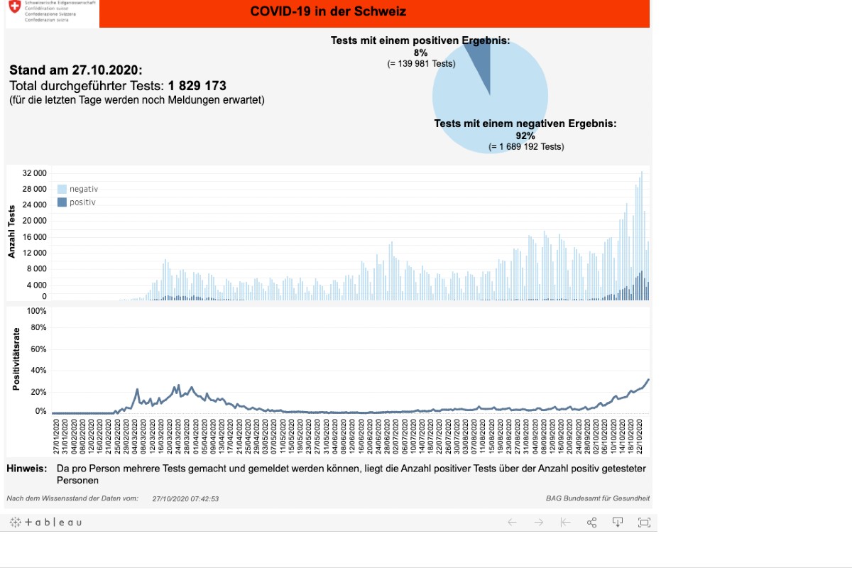 Fallzahlen vom BAG für Dienstag 27.10.2020 - Neu - 20'709 Tests, 5'949, positive Fälle, 28,73 %