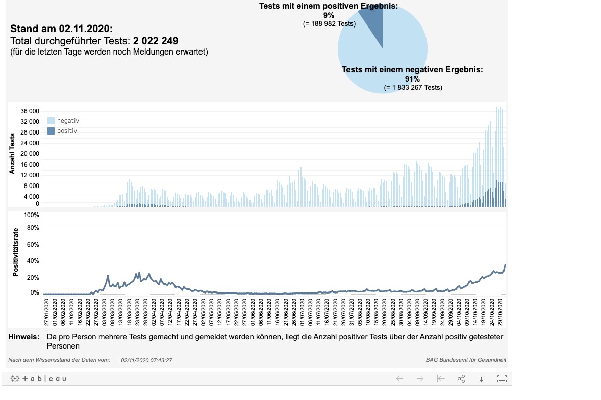Fallzahlen vom BAG für Montag 02.11.2020 - Neu - 88'863 Tests, 21'926, positive Fälle, 24,67 %