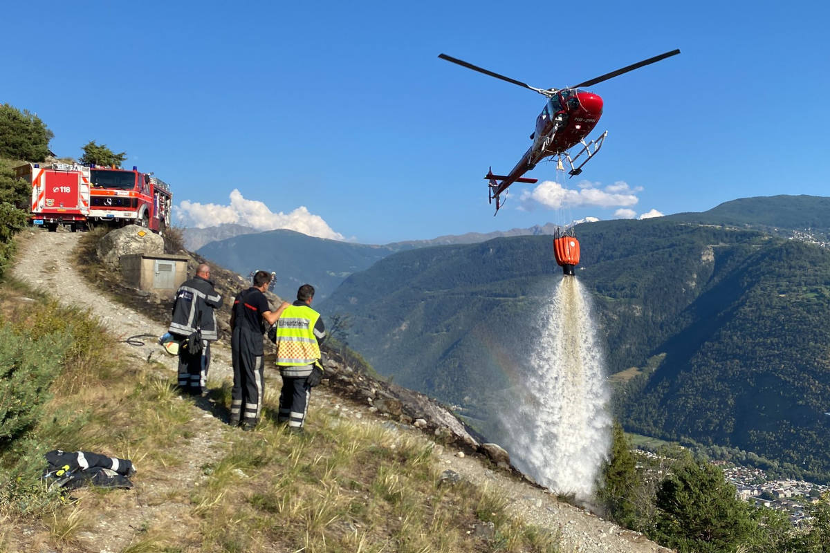 Feuerwehr Raron/Niedergesteln sowie Helikopter der Air-Zermatt im Einsatz. Löscharbeiten sind im Gange.