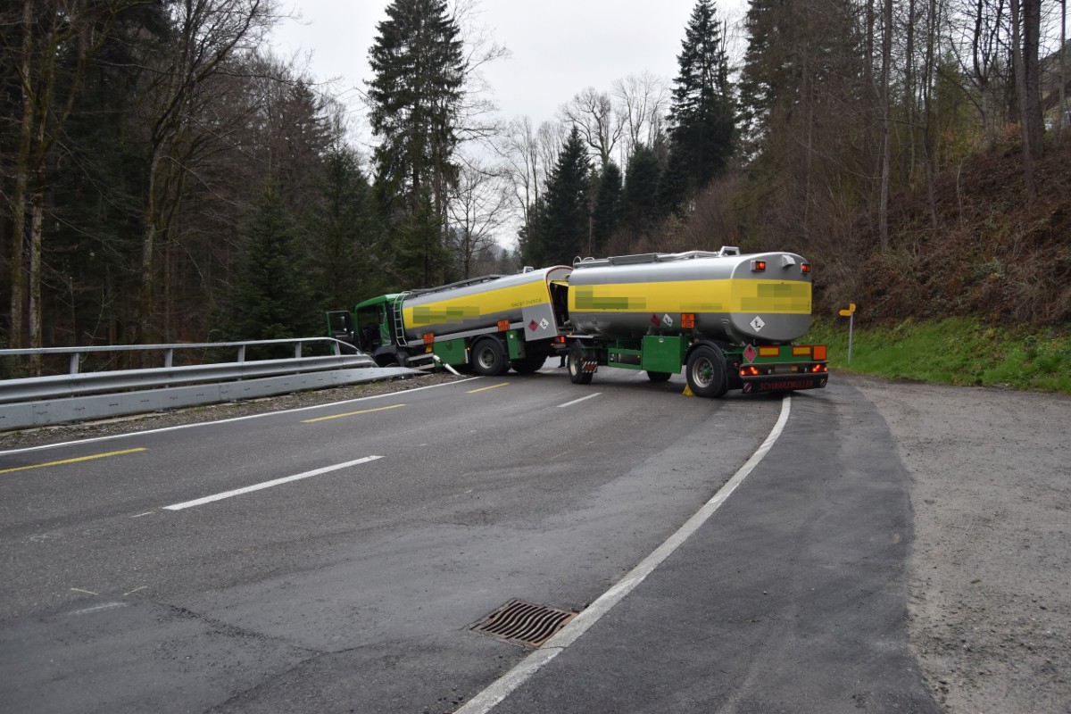 Am Montag, 3. April 2023, ist es in Niederteufen zu einem Selbstunfall eines Tanklastwagens mit Anhänger gekommen. Verletzt wurde niemand. Es entstand Sachschaden.
