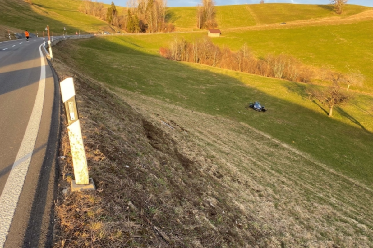 Rund eine Stunde später hat sich auf der Ratenstrasse in Oberägeri ein Selbstunfall ereignet. Ein Fahrzeuglenker ist von Oberägeri bergwärts in Richtung Biberbrugg gefahren, als er aus noch ungeklärten Gründen in einer Linkskurve von der Strasse abkam und eine Böschung hinunterstürzte. Dabei hat sich das Fahrzeug mehrfach überschlagen und kam nach rund 75 Metern auf einer Wiese zum Stillstand.