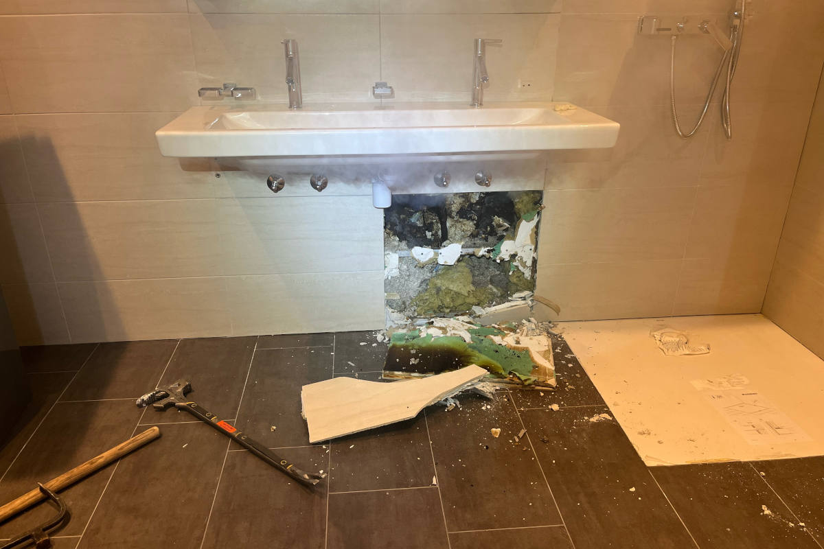 Der 33-jährige Wohnungsmieter bohrte am Freitagabend vier Löcher in die Keramikplatten im Badezimmer, um in den kommenden Tagen ein neues Möbelstück zu montieren. Am Samstagmorgen gegen 06:00 Uhr bemerkte er Rauchgeschmack in der Wohnung und stellte fest, dass es aus den Bohrlöchern rauchte. Die ausgerückte Feuerwehr Region Uzwil stellte hinter der Lavabo-Wand eine starke Wärmeentwicklung fest. Folglich musste die Wand geöffnet, das Dämmmaterial gelöscht und ins Freie gelegt werden. Durch die Brandbekämpfung entstand im Untergeschoss ein Wasserschaden in Höhe von rund 50'000 Franken. Der Schaden durch den Mottbrand kann noch nicht beziffert werden. Die Feuerwehr sperrte die Wiesentalstrasse für die Dauer des Einsatzes.