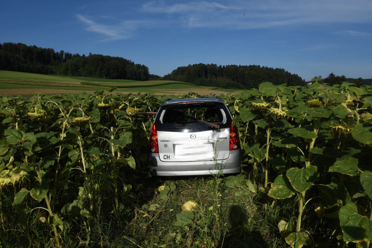 Beim Aufprall schlug eine Holzlatte durch die Frontscheibe und traf den Lenker am Kopf. Die Fahrt endete in einem Sonnenblumenfeld, ca. 130 Meter abseits der Strasse. Der Lenker wurde erheblich verletzt.