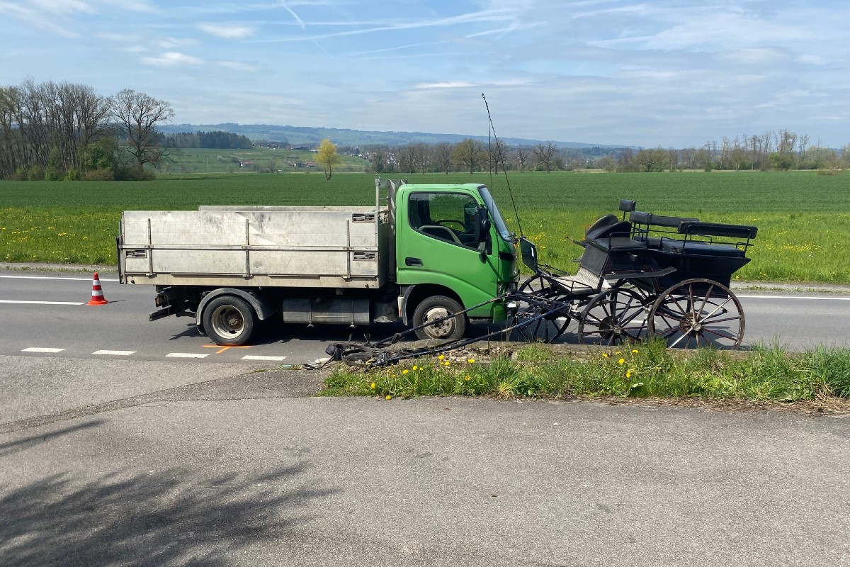 Der Vorfall ereignete sich am Samstagmittag (22. April 2023), kurz vor 12:00 Uhr. Aus noch nicht bekannten Gründen hat sich ein Pferd, welches mit der Kutsche auf einem Vorplatz in Hünenberg stand, erschreckt. Daraufhin ist es einen Absatz hinuntergesprungen, wobei der Kutscher von der Kutsche fiel. Das Tier verhedderte sich bei der Rückkehr auf den Vorplatz in einem auf der Strasse stehenden Lieferwagen. Dabei riss sich das Pferd aus dem Geschirr los und brannte über die Felder in Richtung Frauenthal durch. Es konnte schliesslich durch Anwohner eingefangen werden.