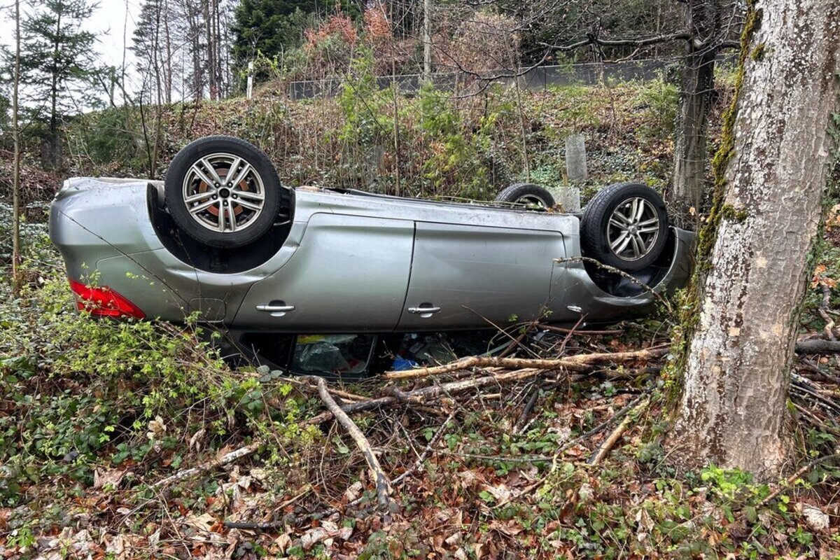 Folglich fuhr das Auto über das steil abfallende Waldbord, überschlug sich und kam schliesslich im Wald auf dem Dach liegend zum Stillstand. Der Fahrzeuglenker blieb unverletzt. Der Personenwagen wurde stark beschädigt und erlitt Totalschaden.