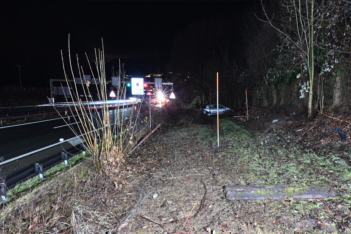 Das Auto des mutmasslichen Unfallverursachers geriet rechtsseitig die Böschung hinauf, durchschlug einen Wildschutzzaun und prallte gegen einen Baum.