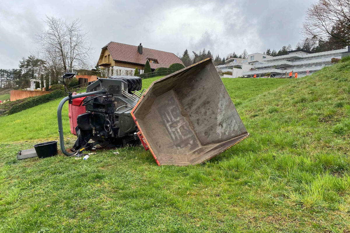 Der Motorkarren prallte mit dem Heck in die Mauer eines Vorplatzes einer Liegenschaft, fuhr wieder vorwärts durch einen Maschendrahtzaun und über eine Wiese. Nach rund 50 Metern, einer Linkskurve sowie einem Bremsmanöver kippte der «Dumper» zur Seite und kam dort zum Stillstand.