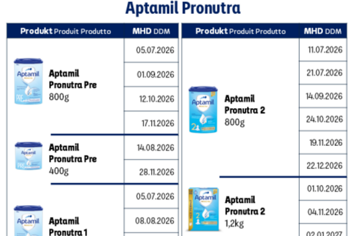 Danone ruft in Abstimmung mit den Schweizer Behörden bestimmte Produktionschargen von Aptamil in der Schweiz zurück. Kunden werden gebeten, die Produkte nicht mehr zu verwenden und sie umzutauschen oder zurückzugeben.