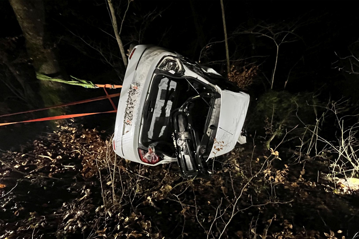 Anschliessend überquerte das Fahrzeug die Fahrbahn und rutschte in der Folge die abfallende Böschung in den Wald hinunter. Dort kam der weisse Renault auf der Seite liegend zum Stillstand.
