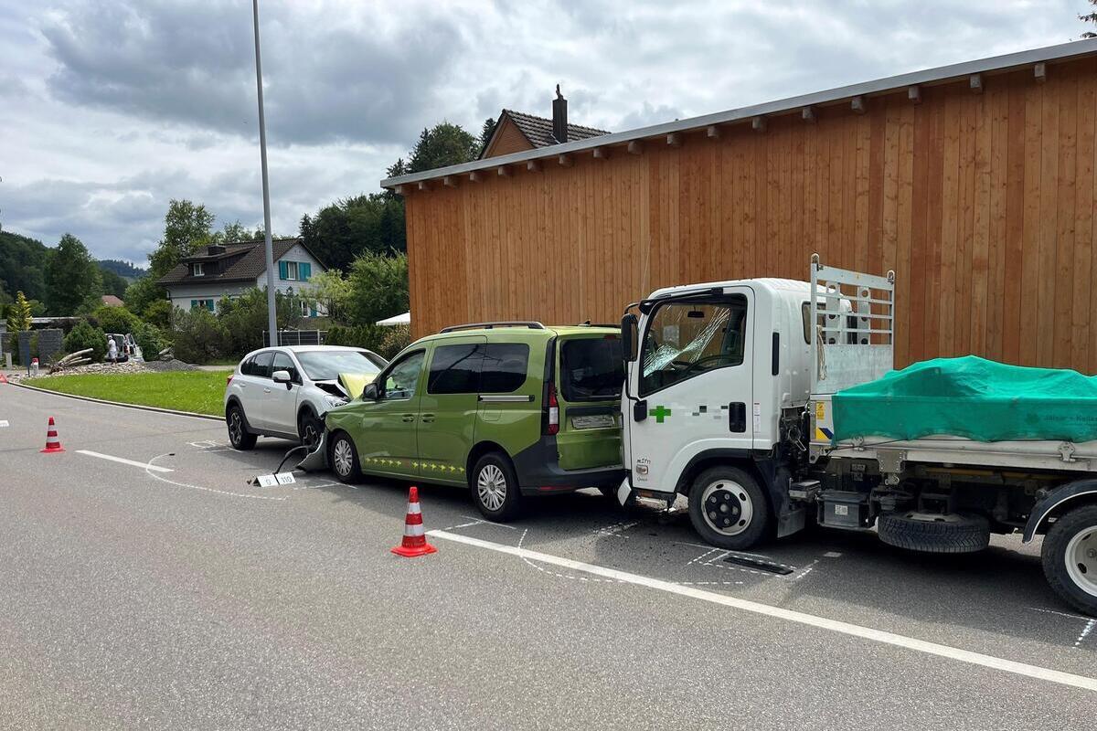 Kurz vor 12.30 Uhr fuhr ein 84-jähriger Mann mit seinem Auto auf der Tösstalstrasse von Bauma in Richtung Saland. Auf Höhe des Weilers Dillhaus geriet er Ausgangs einer leichten Linkskurve aus ungeklärten Gründen auf die Gegenfahrbahn. Dort kollidierte sein Fahrzeug frontal mit einem entgegenkommenden Personenwagen, in dem sich zwei Personen befanden. Ein von Saland kommender Lieferwagenfahrer bemerkte den Unfall zu spät und prallte mit seinem Fahrzeug gegen das Heck eines der Unfallfahrzeuge.