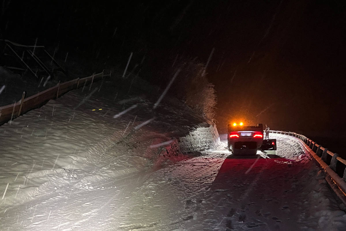 Ein talwärts fahrender Personenwagen kam in einer Rechtskurve ins Rutschen, fuhr das gegenüberliegende Strassenbord hoch und kippte aufgrund der dortigen Stützmauer auf die Strasse zurück. Der Personenwagen kam auf dem Dach liegend und mitten auf der Fahrbahn zum Stillstand.