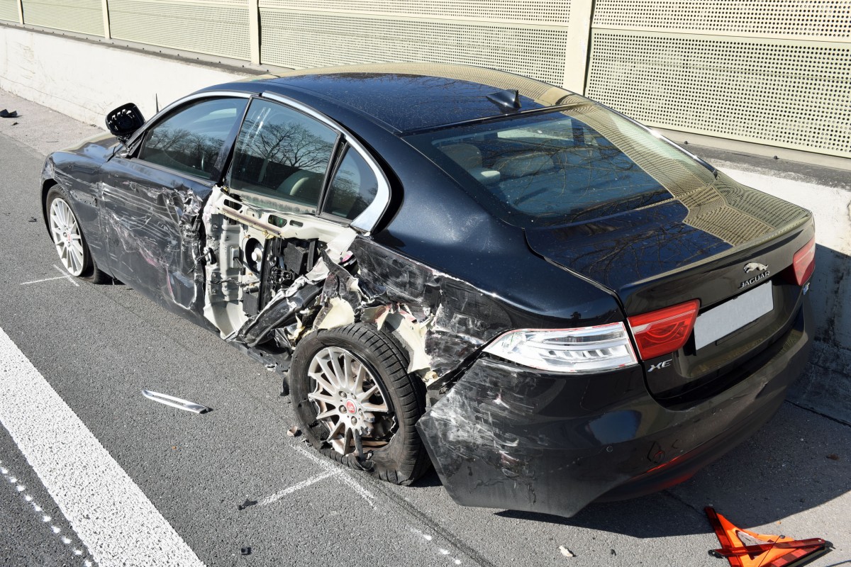 Der auf dem Pannenstreifen stehende Jaguar wurde massiv beschädigt. (Bildquelle: Luzerner Polizei)