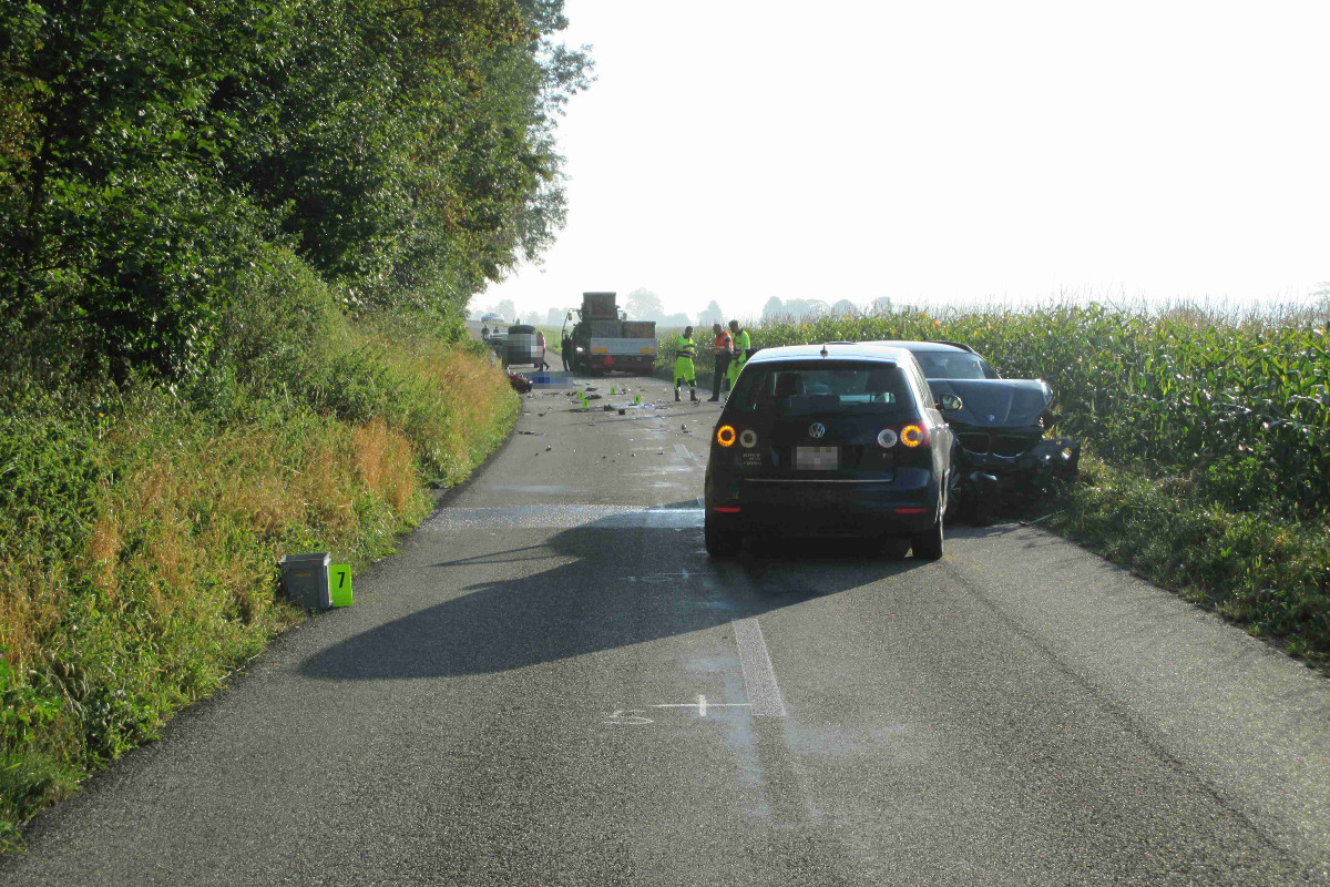 Im Bereich einer leichten Linkskurve wollte der Motorradlenker die beiden Fahrzeuge überholen. Dabei kollidierte er auf der Gegenfahrbahn seitlich-frontal mit einem entgegenkommenden Auto.