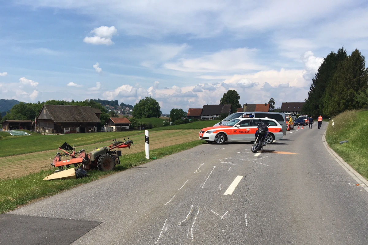 Bei einer Kollision zwischen einem Motorrad und einem Handmotormäher hat sich der Töfffahrer am Dienstagmittag (22.5.2018) in Schönenberg tödliche Verletzungen zugezogen.