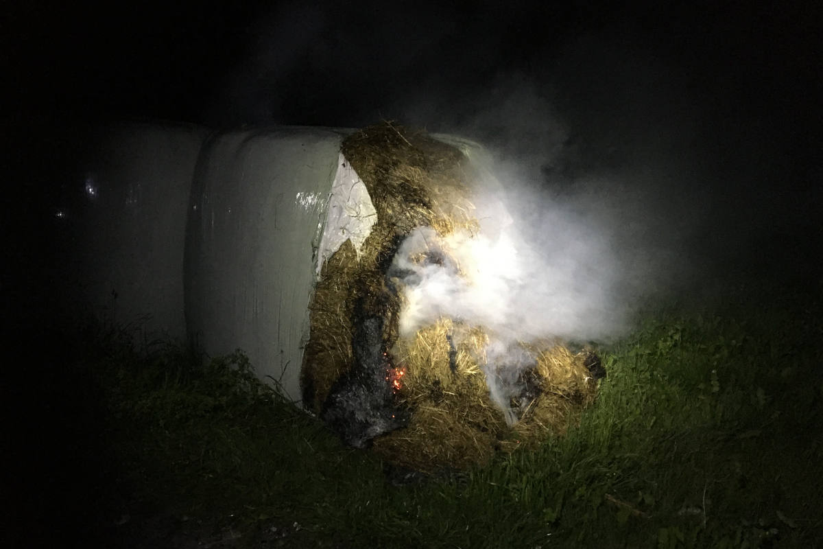Kurz darauf wurde auf einer Wiese hinter dem Kieswerk eine brennende Siloballe entdeckt. Der Mottbrand konnte durch Einsatzkräfte der Feuerwehr ebenfalls rechtzeitig gelöscht werden.